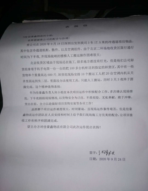 雖然整個(gè)項(xiàng)目運(yùn)作難度很大,時(shí)間緊迫,且現(xiàn)場(chǎng)運(yùn)作條件艱苦,但是佳豪鑫物流運(yùn)作團(tuán)隊(duì)在人員安排和時(shí)間上給予我們現(xiàn)場(chǎng)施工方完美的配合,讓項(xiàng)目接收工作有秩序和圓滿完成。